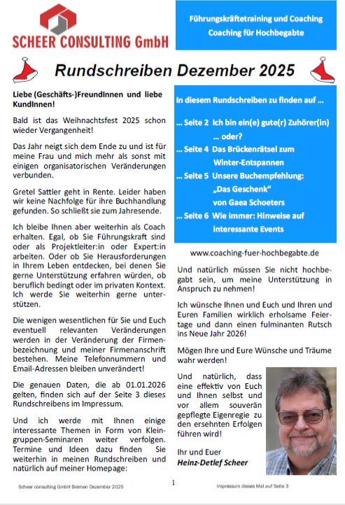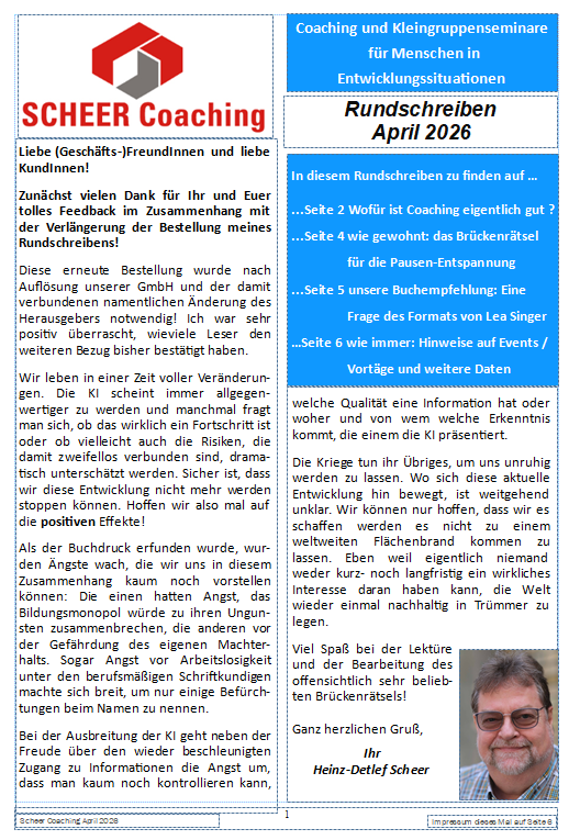 Mein Rundschreiben erscheint gewöhnlich alle zwei Monate und enthält nicht nur wichtige, vielleicht für Sie interessante Termine. Auch ein Brückenrätsel für eine (ent)spannende Pause und Beiträge zum Thema Coaching, zur persönlichen Weiterentwicklung im beruflichen und privaten Kontext.